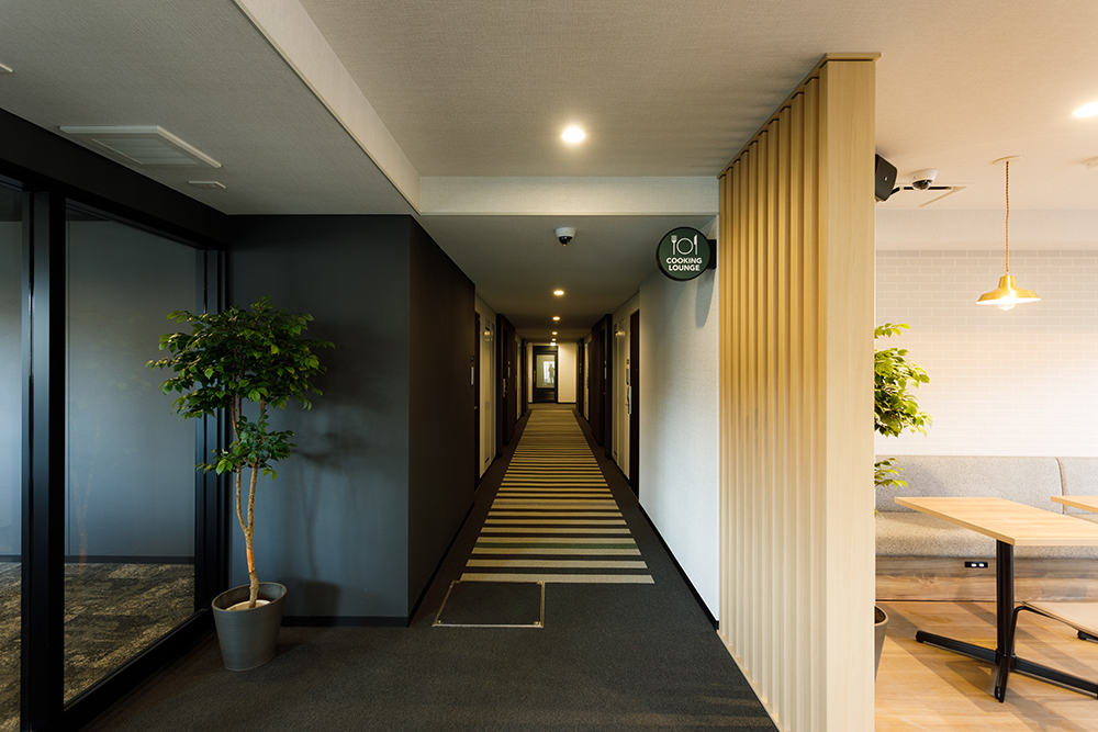 学生向けマンションの廊下。5階建ての 2棟に、生活に合わせた多彩なパターンの 全110室を完備