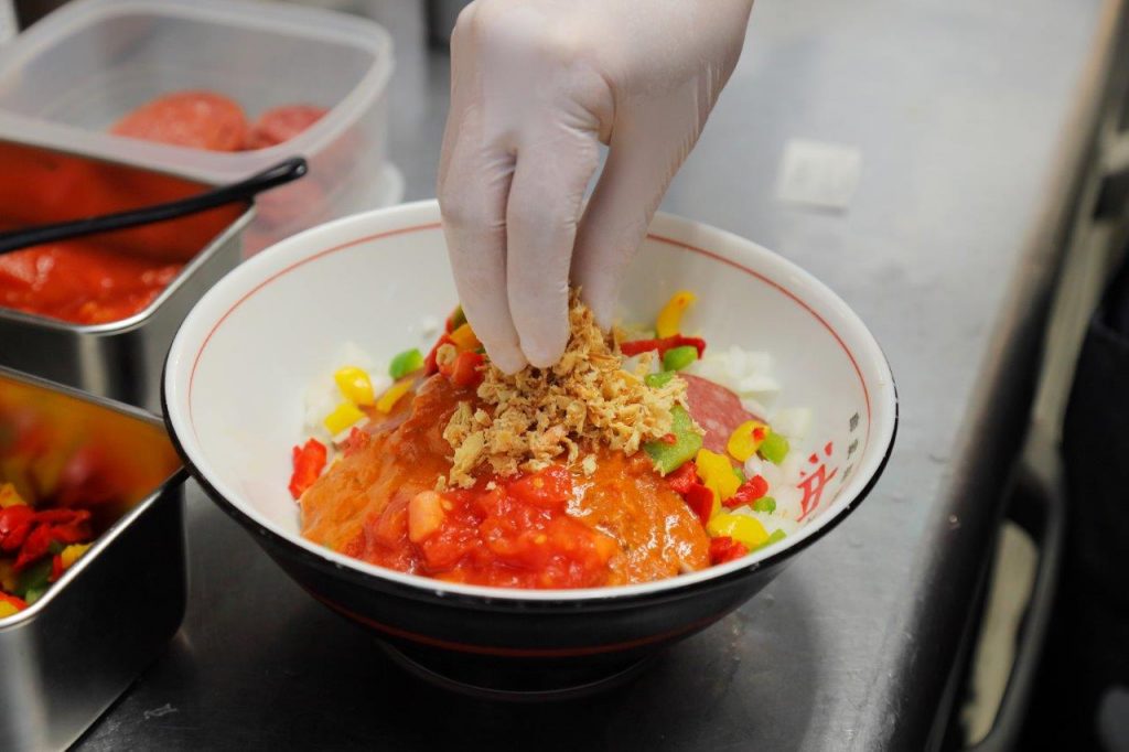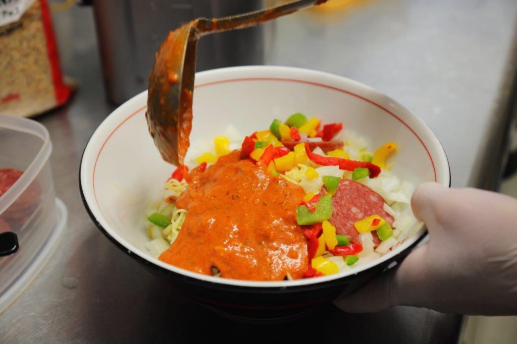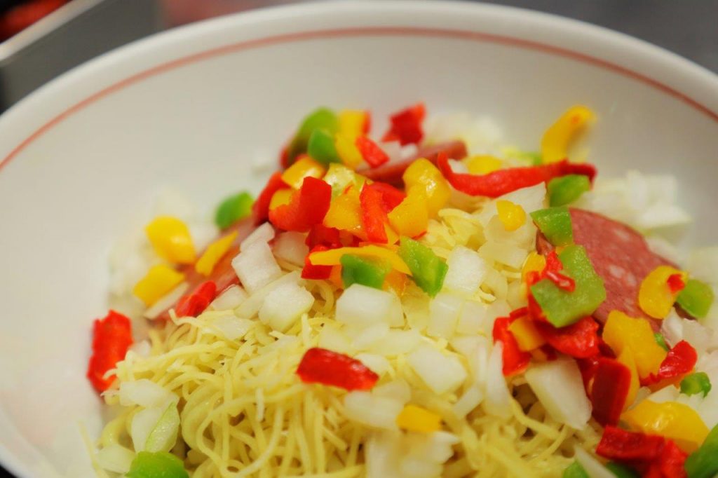特製麺に、ソースと彩り豊かな具材をトッピング。ピザの味わいを表現するために、チャーシューではなくサラミを使っています。