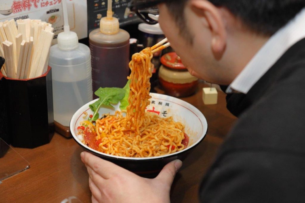 マタギがひと足お先にコラボラーメンを実食していると、ここでもS-style営業担当でラーメンマニアのモツヲが乱入。