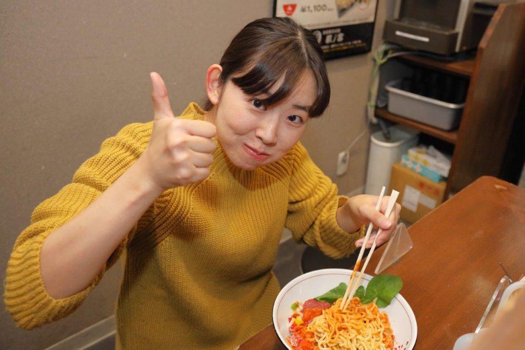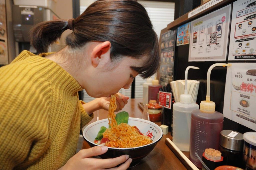 「丼ぶりの底から麺をひっくり返すと、油そばのタレとトマトソースが混じり合い、そこにチーズが追い討ちをかけてかなり濃厚な口あたりに。そんな中でさいの目切りにされた野菜のシャッキリとした歯触りがさわやかなアクセントになります!トマト味のパスタと捉えればタバスコを振りかけるのはもちろん、油そばの定番には欠かせない酢とラー油をかけてもさらに味わいの幅が広がります!」(モツヲ)