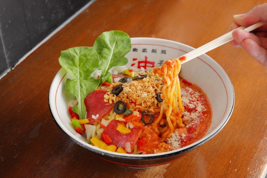 「麺にはパスタに使われるデュラム粉を配合してみました。モチモチの歯触りでソースとも相性抜群!ソースは、ピザソースをベースに生クリームやオレガノを入れてクリーミーに仕上げました」(金城)