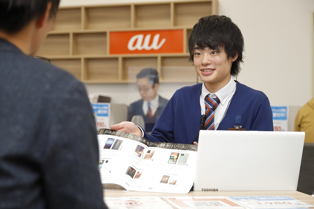 「人と関わる接客の仕事がしたいと思い入社しました。入社後はお辞儀の仕方や言葉遣いなどマナーを一から学び、最近はトレーナーのサポートなしに1人で接客を行うようになりました。料金プランやサービスは複雑なので、自分が説明したことに「なるほど」と理解してもらえた時が一番うれしいです。お客様の不安や疑問を解消し、最後に笑顔で帰っていく姿を見るとやりがいを感じます。「また来ます」と言ってもらえる接客を目標に、今は「auアドバイザー」の資格取得に向けて勉強中。将来は店舗運営をする店長になって会社に貢献したいです。」(加藤 暖稀さん)