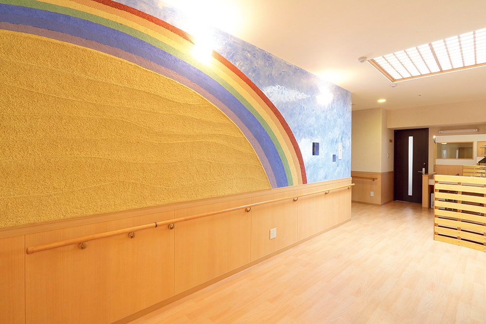 掻き落とし仕上げ、版築仕上げ、イタリア磨きで描かれた虹。明るい雰囲気で迎えてくれる