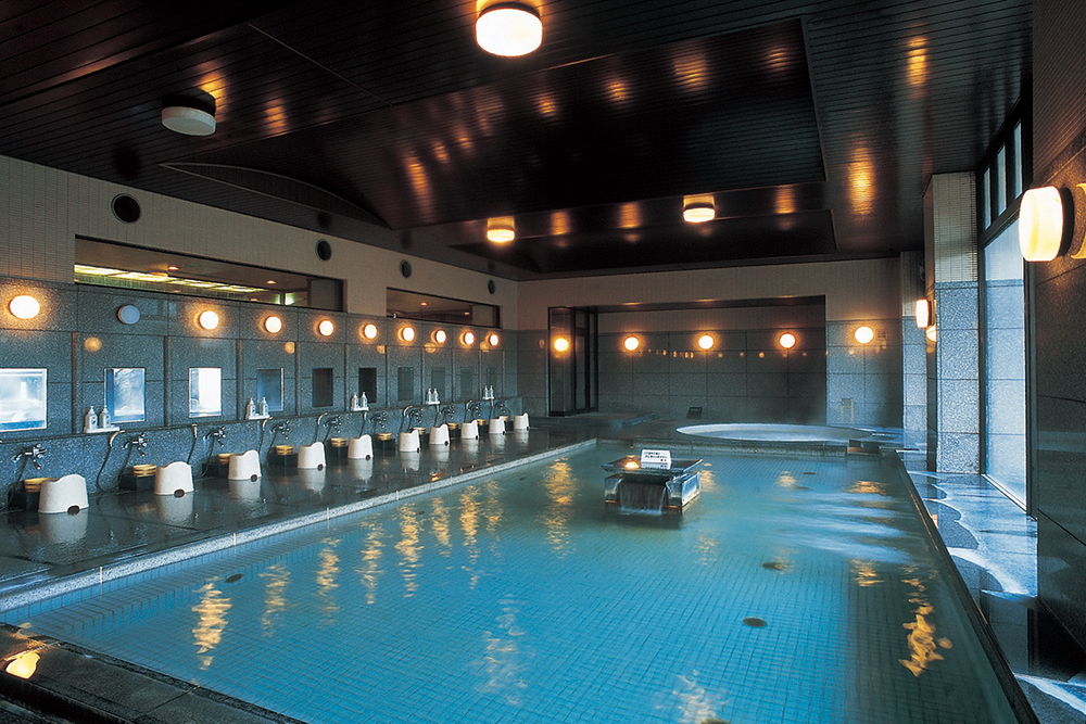 広々として明るい雰囲気の大浴場。やわらかな湯が浴槽からあふれています。蔵王連峰を望む露天風呂もお見逃しなく!