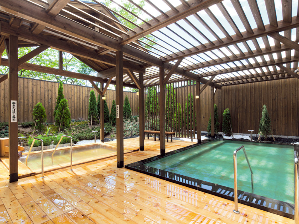 石造りと木造の2つの湯船が楽しめるウッドデッキ調の露天風呂。大浴場も広々としていて、ゆったりと過ごせます
