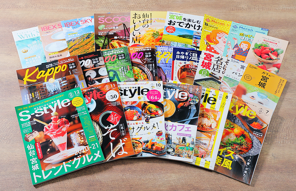 メディア出版事業では、仙台・宮城エリアでリーチ数ナンバー1を目指す『せんだいタウン情報S‐style』、大人のためのプレミアムマガジン『Kappo仙台闊歩』といった定期刊行物のほか、温泉、グルメなどを一冊にまとめた臨時増刊を発行。紙媒体だけにとどまらず、Web、SNSとも組み合わせてタイムリーな情報を発信している。