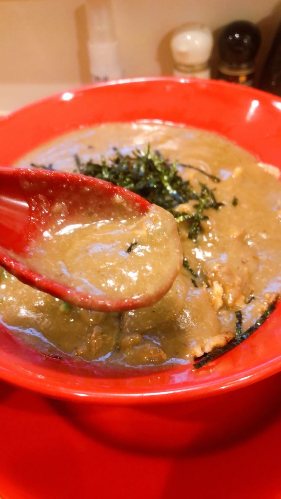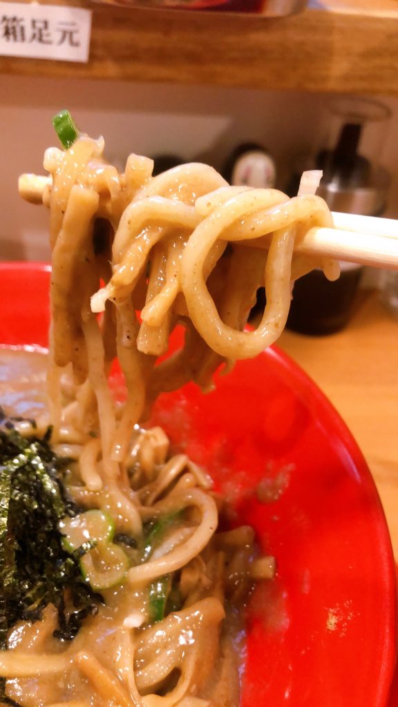 もっちりとした太麺に、ドロドロなスープが絡み、一口すすると口いっぱいに魚介の旨みが広がります。