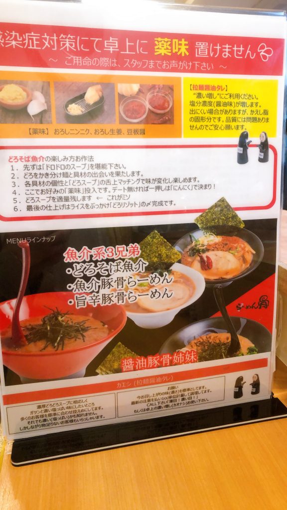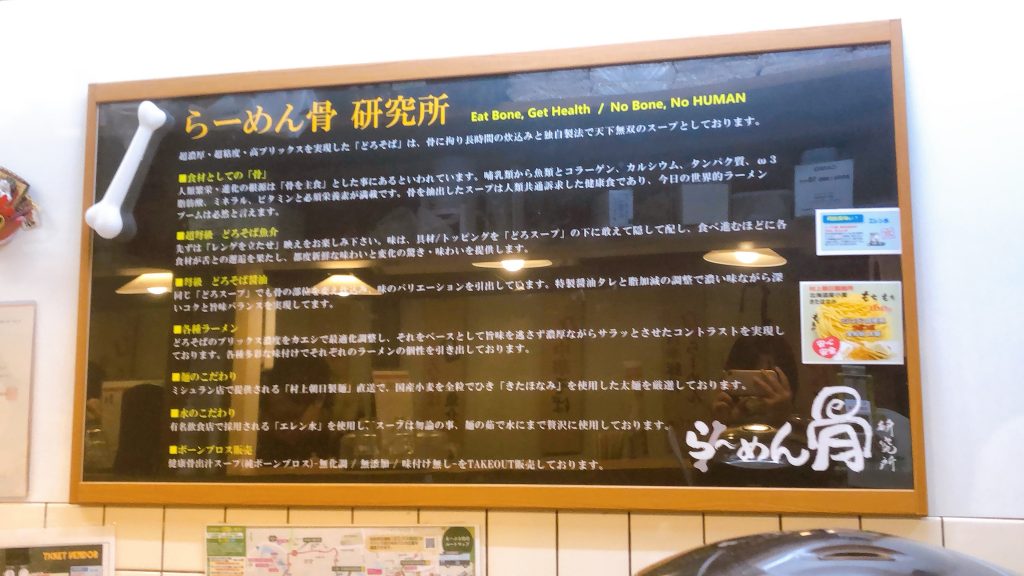 ラーメンが出てくる間、店内を見渡すと、『らーめん骨研究所』のこだわりや、おいしい食べ方の案内などを発見。