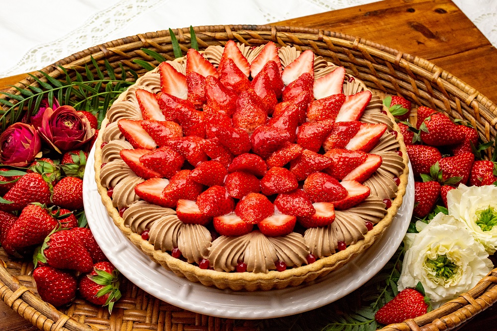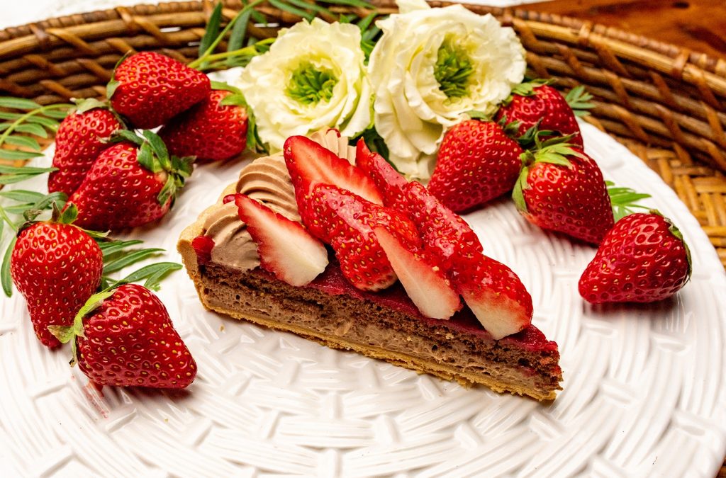 クリーミーな自家製チョコレートカスタードに甘酸っぱいジャムを重ね、旬のイチゴをたっぷり飾ったタルト。イチゴとチョコレートクリームのバランスにこだわったひと品です。