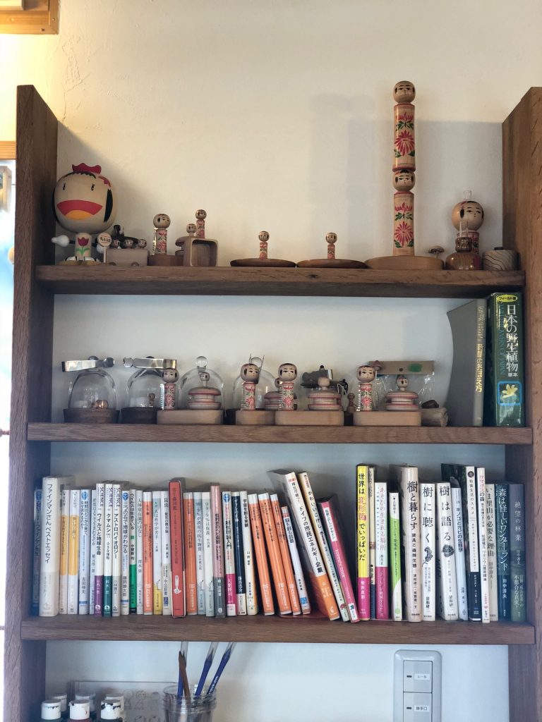 本棚に本より多く(?)並ぶこけしたちを見つけたり