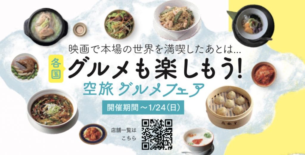 期間限定で「空旅グルメフェア」開催中です!映画で本場の世界を満喫した後に、「空旅グルメフェア」参加店で各国のグルメを味わってみるのはいかがでしょうか?