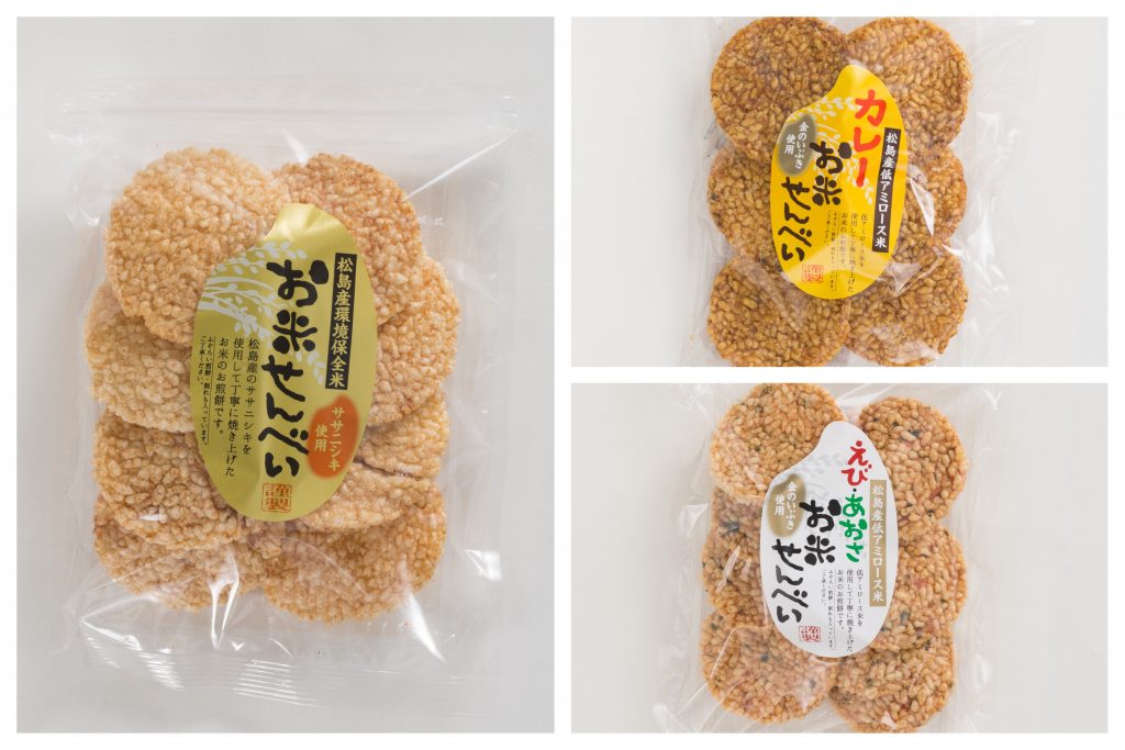 松島産のササニシキや金のいぶきを原料に使った「お米せんべい」。米本来の味を損なわず食感も楽しめるよう、米粒を残して仕上げています。油きりをしっかりすることで、サクッとした歯触りとさっぱりとした味わいを実現。取り寄せ専用商品なので、詳細はホームページをご覧ください!