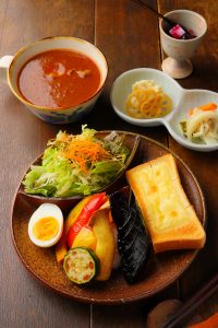 「季節の野菜スープカレー」(900円※写真は夏のカレー)。前菜とサラダ、チーズトースト、デザート付きです