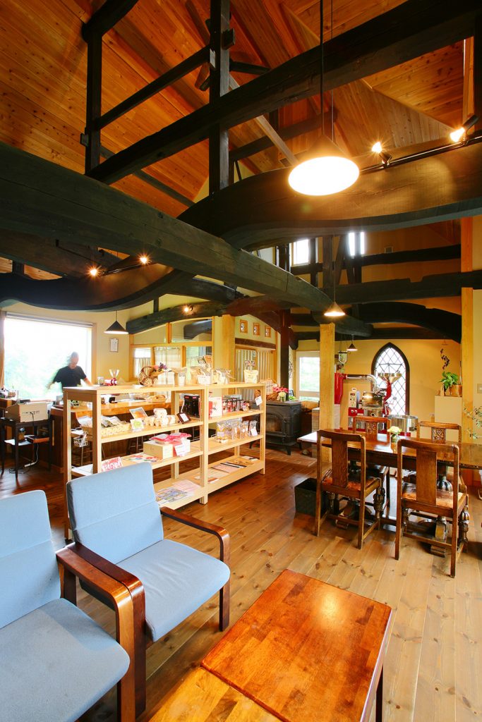 カフェ空間にはアンティークの棚が置かれ、作り手の想いにあふれた器が並ぶ