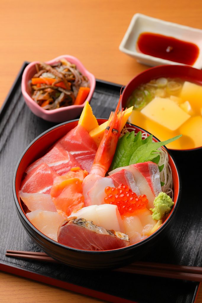 元々鮮魚店として昭和30年ころに創業したが、ひょんなことから飲食店の営業を求める声が高まり、海鮮丼の店としてリニューアル。丼を覆うネタは、魚屋の目利きで市場から仕入れたものです。とにかく新鮮さにこだわり、マグロは天然生マグ口を使うなど上質のものを低価格で提供する。コスパ抜群の「海鮮丼」(900円)も人気ですが、それをグレードアップさせた「特選丼」は、さらに満足度が高くおすすめです。