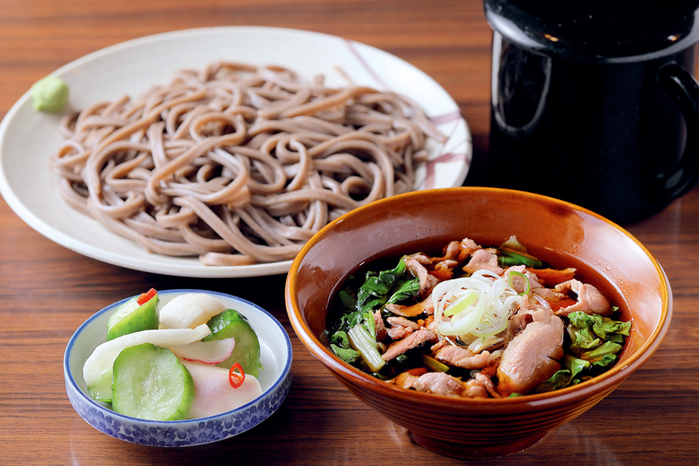 創業からおよそ60年になる『新楽』では、大ぶりな鴨肉が入った「かもそば」が大人気! 店主が蔵王山麓の名水で打つ香り豊かな田舎そばは、ホシも混ざり食感も楽しめます。自家栽培のケールなどの旬野菜と、鴨肉の旨みが溶け出したそばつゆとの相性も抜群ですよ。