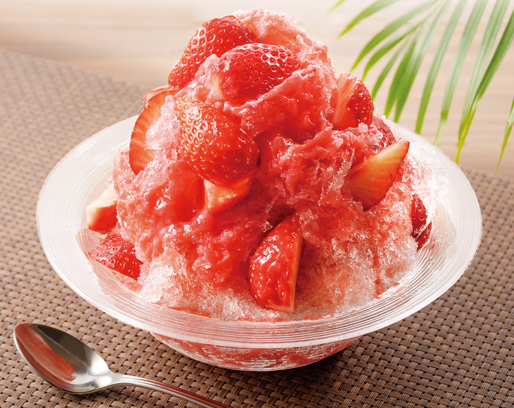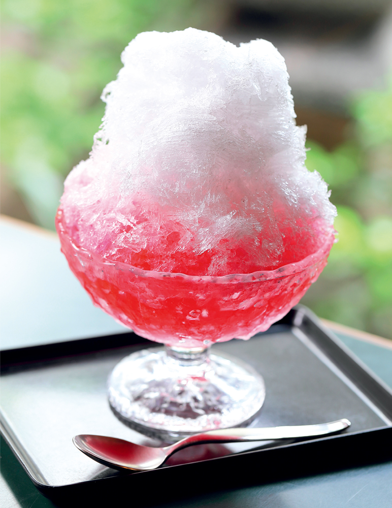 人気の甘味処『彦いち』が提案するのは、王道の苺かき氷。ゆっくりと凍らせた氷を削り、ふんわりとした食感に仕上げています