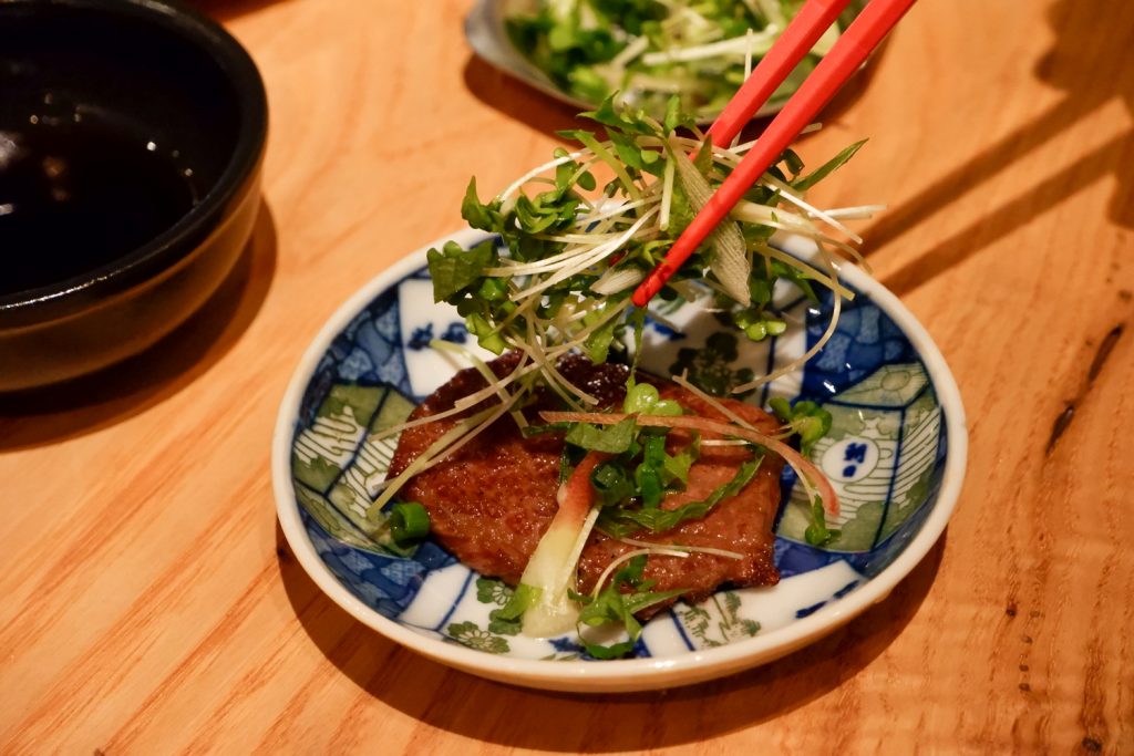 『うしHAJIME』さんでは、焼肉のタレはもちろん、特製の「薬味ミックス」でいただくのもおすすめ。ミョウガやカイワレ大根など、シャキシャキの薬味をたっぷり添えて、ポン酢ジュレと共にパクリ。お肉の脂感に薬味の香りが合わさって、これはたまらん~!
