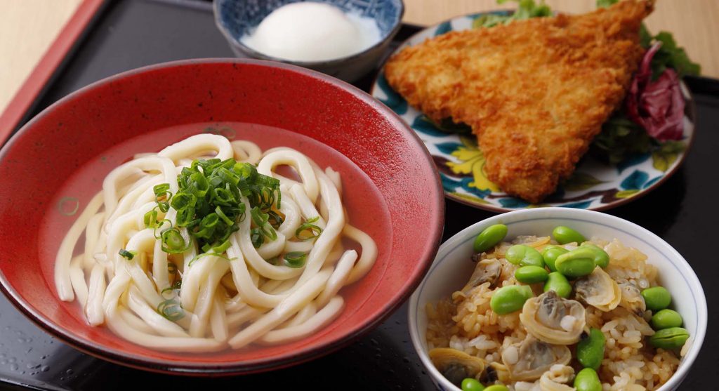 のど越し抜群の自家製うどんを届ける『七右衛門』。コシのある麺をすすって汁をひと口飲めば、いりこダシを使ったやさしい味わいが身体に染み渡る。日替わりのご飯とおかずが付いて、満腹指数も振り切れること間違いなし!