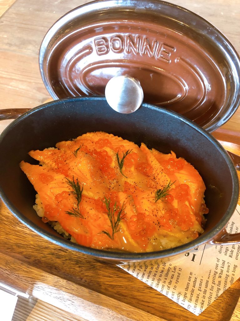 バター醤油香るサーモンといくらのココットごはん(869円)