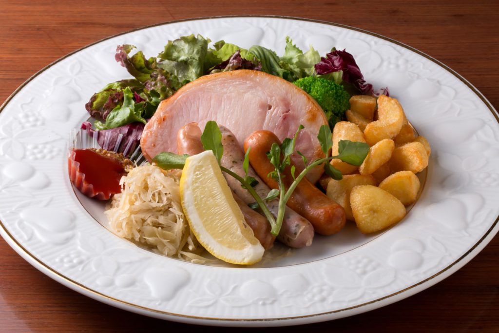 仙南産の豚肉を素材にしたウインナーやハムが並ぶ「シンケンプレート」(1,280円・税込)。ウインナーはハーブ、粗びき、チョリソーの3種類
