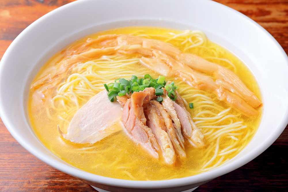 飽くなき探求心とセンスで進化系ラーメンを生み出す『NOODLE MAN』。名物の「純鶏SOBA」は、鶏だけを丁寧に煮込み、塩でシンプルに仕上げた清湯スープが絶品です。凝縮された鶏の深いコクと香りが引き立つように、塩は岩塩と沖縄産塩をブレンドして使用しています。細ストレート麺と中太縮れ麺の2種から、好みの麺を選べるのもうれしいポイントです。