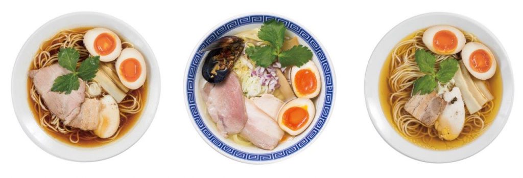 1号店の「飛魚だし醤油そば」、「貝だし塩そば」、「鶏だし生醤油そば」