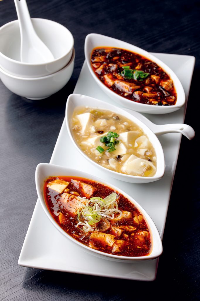 オープン当初から人気を独占し続ける、3つの味を楽しめる欲張りなひと品。写真手前の赤が最も辛く、自家製麻辣醤の痺れが舌先を刺激します。真ん中の白は、海鮮スープとオリジナルの透明なラー油を使ってあっさりとした後味に。甜面醤を使った黒は濃厚さが評判で、コクと旨みのバランスが一番よいと店主が語る自信作です。