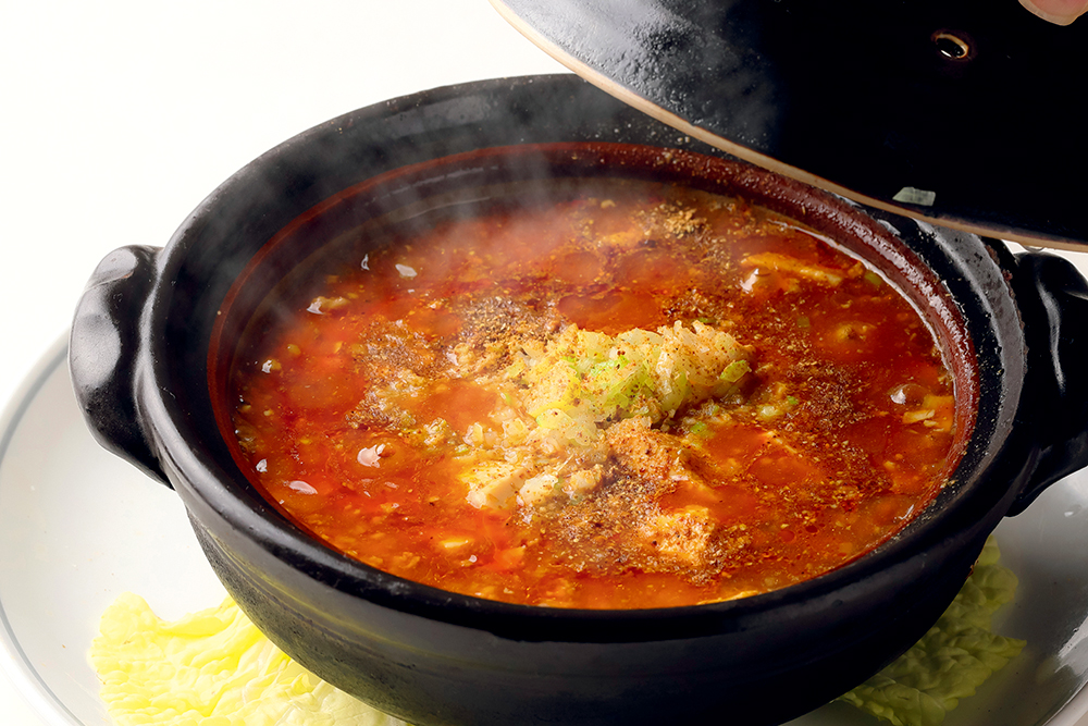 蓋を開けた瞬間の華やかな山椒の香りにはじまり、じんわり後引く辛みと旨みの余韻まで、おいしさが続くあつあつ土鍋麻婆。ひと口目はマイルドな印象ながら、豆板醤やたまり醤油、牡蠣油でしっかり下味をつけた肉餡が全体を引き締め、レンゲを持つ手が止まらなくなること請け合いです。プロならではの絶妙な奥深さに虜になってしまうはず。