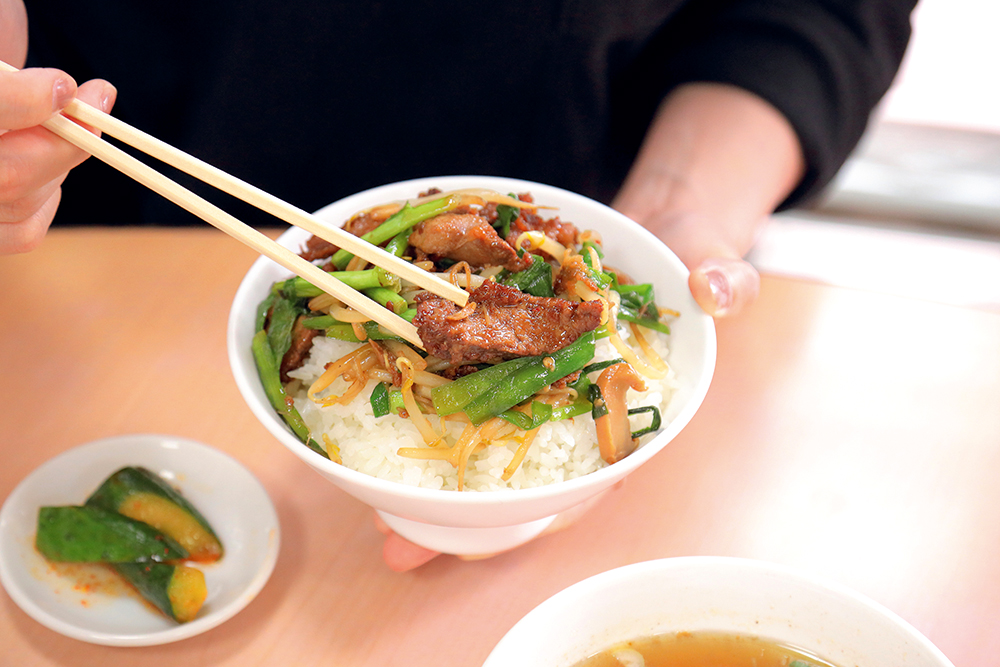 “オンザ白米”がおすすめ。ライスは+100円で、「ニラレバ」は+200円で大盛にできます