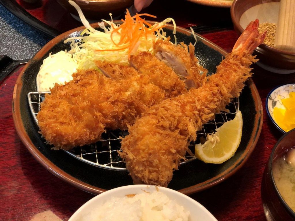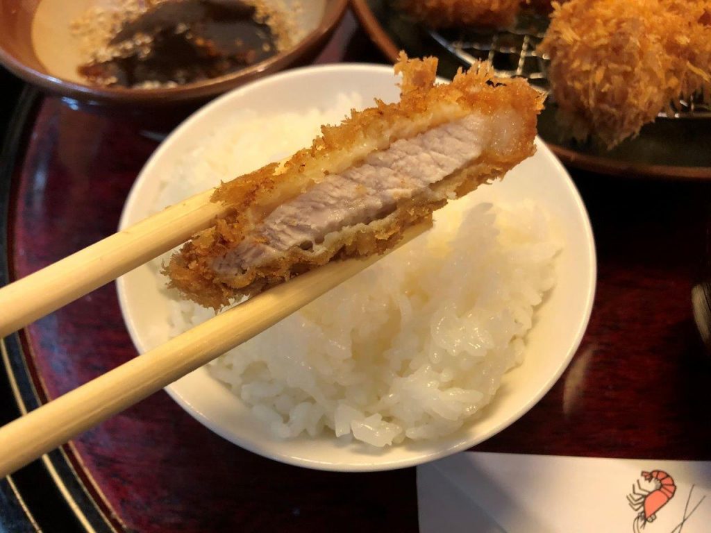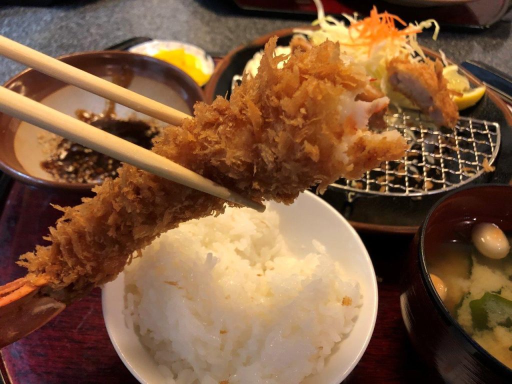 エビフライはプリップリ!女将さん曰く「最初のひと口は大きく頬張らないとこぼれるよ!」とのこと