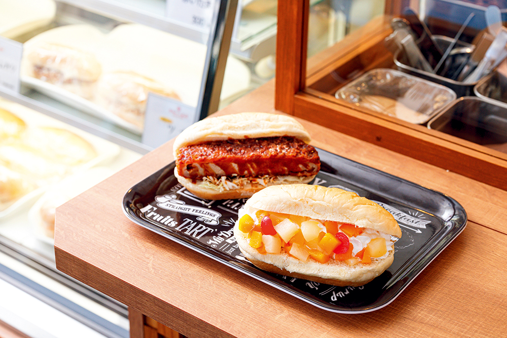 「フルーツ生クリーム」(写真手前・270円)、「四元豚ジャンボロースカツコッペ」(495円)