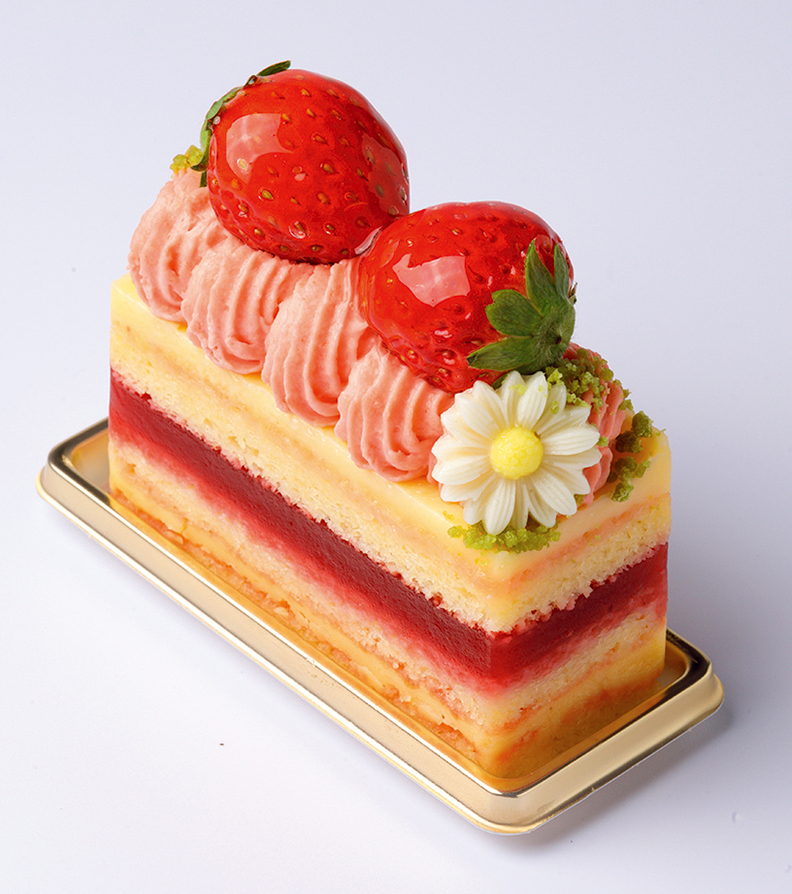 イチゴとカスタードクリームをサンドして、ウィーンの伝統菓子をにこにこベリー仕様にアレンジ。交互に重ねた焼きメレンゲとビスキュイは、サクっと軽い口あたり。