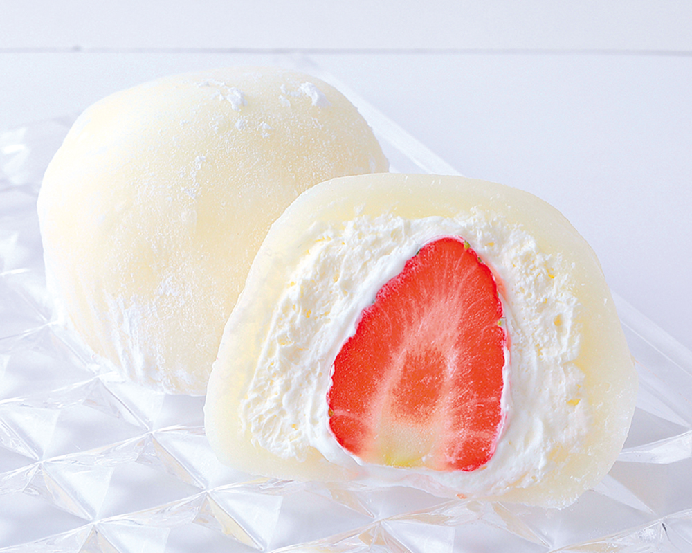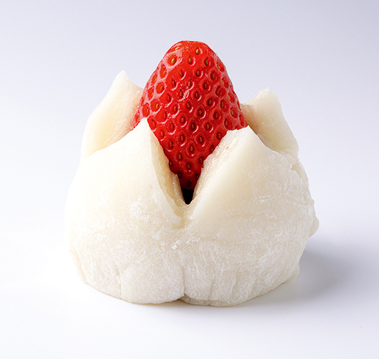 やわらかい求肥の中身は、たっぷりの生クリーム、そしてにこにこベリーが丸ごと一粒! 豪快に頬張って、口いっぱいに広がる香りを楽しみたい。