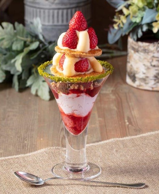 3月に登場した「苺たっぷりパンケーキ」に続き、山元町「燦燦園」のイチゴを使用したパフェが4月から提供中。