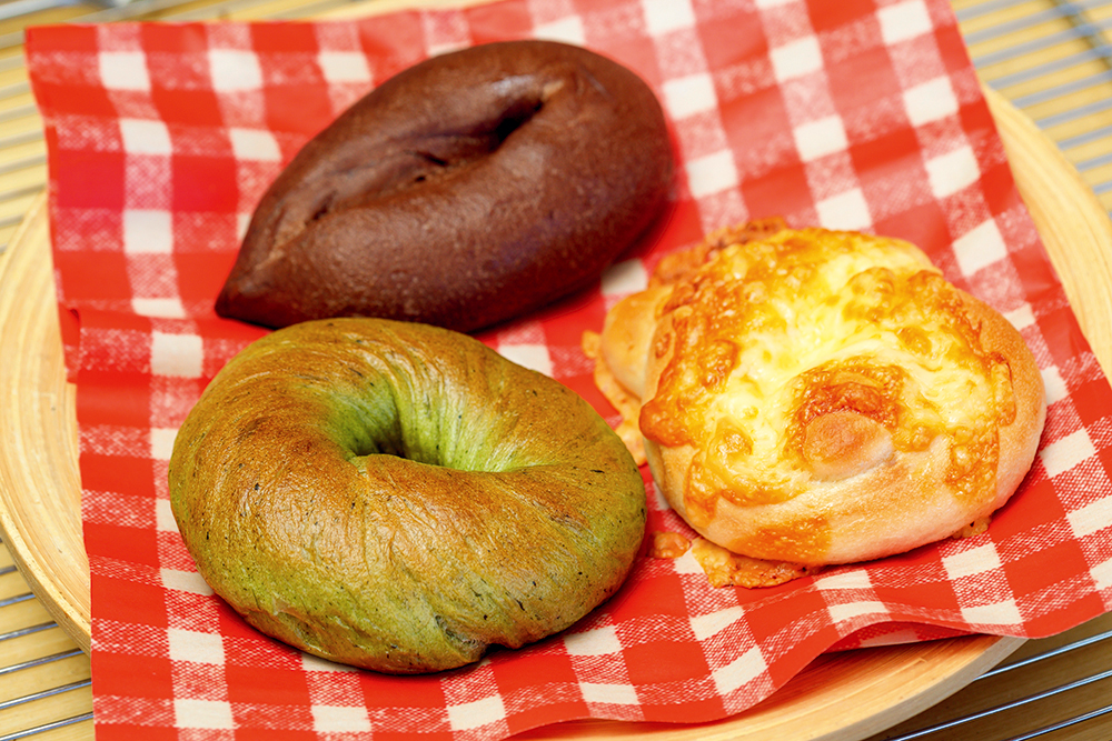 定番人気の「ほうれん草」(170円・写真左)、「ダブルチョコレートベーグル」(190円・写真奥)、「こんがりチーズベーグル」