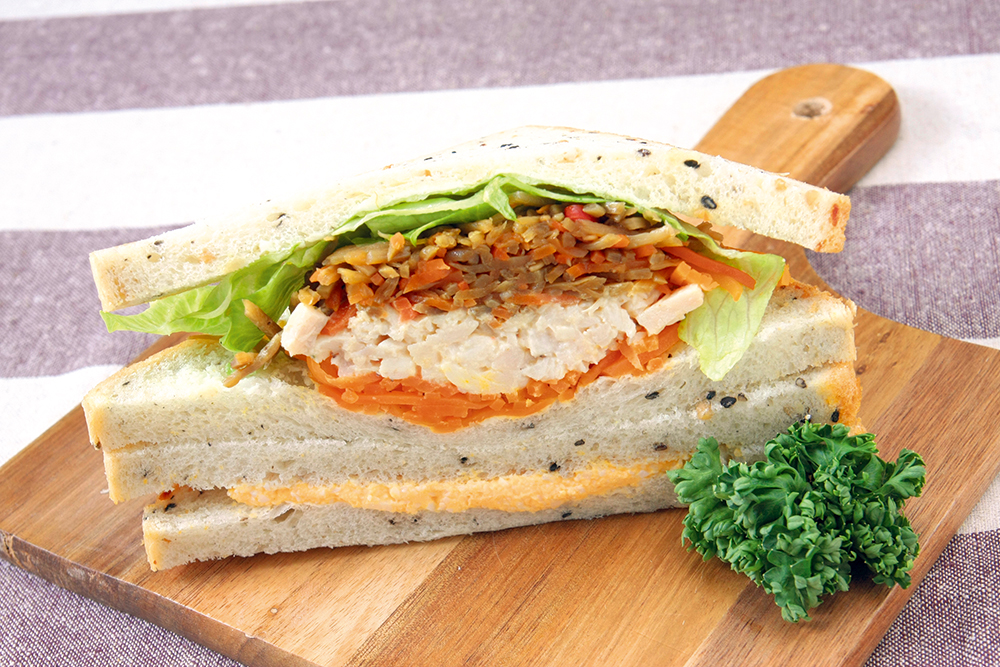 仙台市民に愛され続け、創業93年を迎える老舗。食事パンや菓子パンといったパン類からホールケーキまで、幅広くラインナップしています。「五穀のヘルシーサンド」は、五穀を練り込んだパンの間に、根菜やタマゴサラダ、蒸した鶏ムネ肉がたっぷり! ほんのり醤油を効かせた和風の味付けで、万人に愛される味わいですよ。