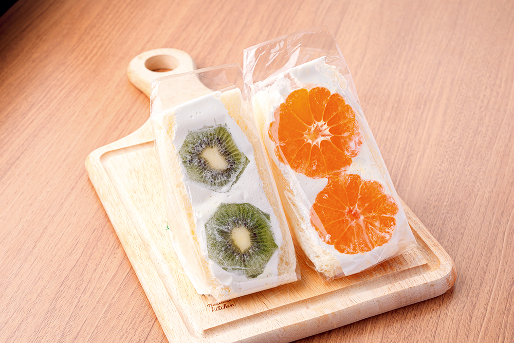 「フルーツサンド」(一種302円~、イートインの場合308円~)。イチゴやミカン、キウイ、パイナップルなど季節の果物が登場