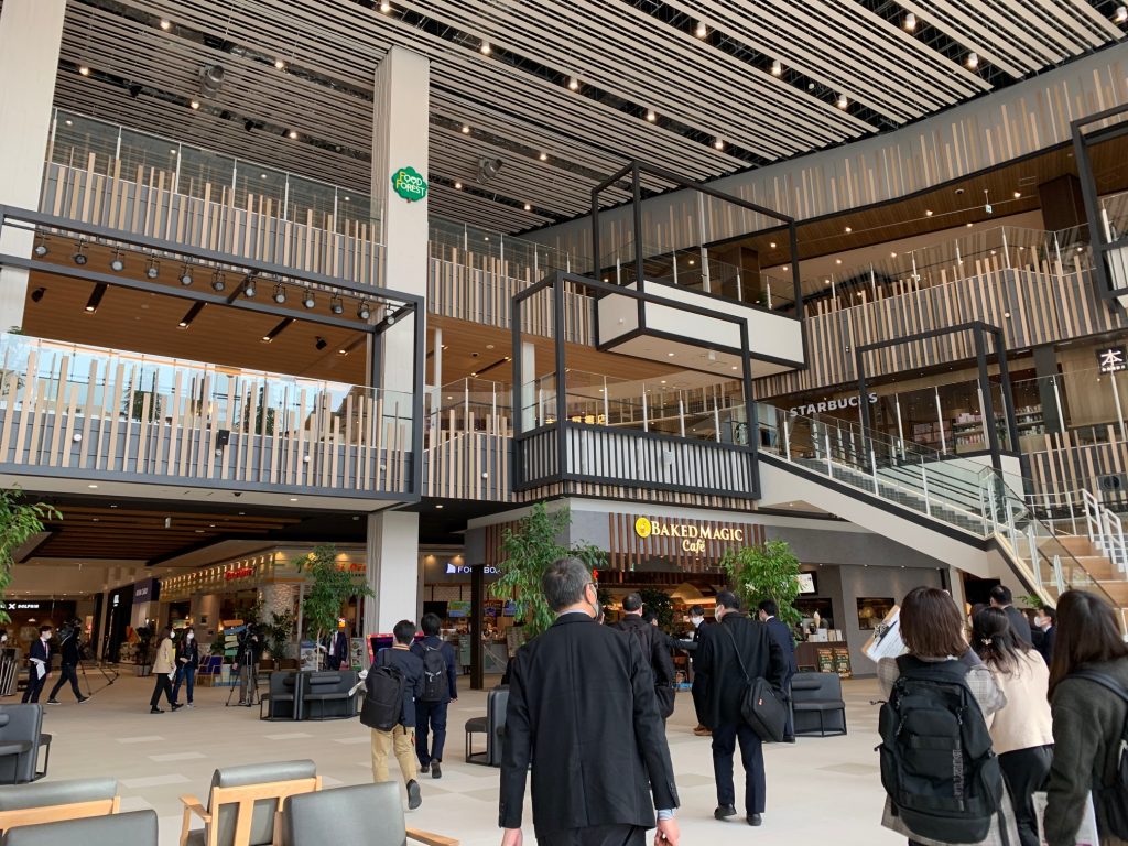 各メディアが内覧会に参加しました。利府街道の仙台方面から見て、正面にある大きな吹き抜けは、このようなロビーになっています。おしゃれで迫力大!