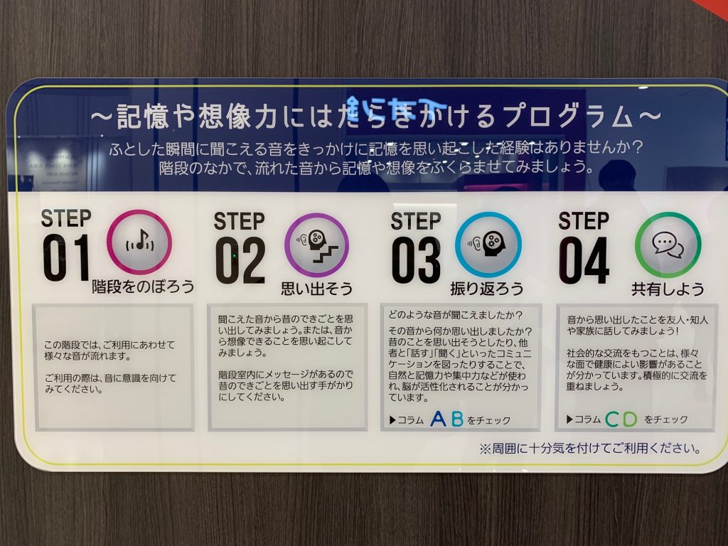 「イオンモールウォーキング」の一環として、階段には「CLIMB WALKING」という「記憶や想像力にはたらきかけるプログラム」を設置