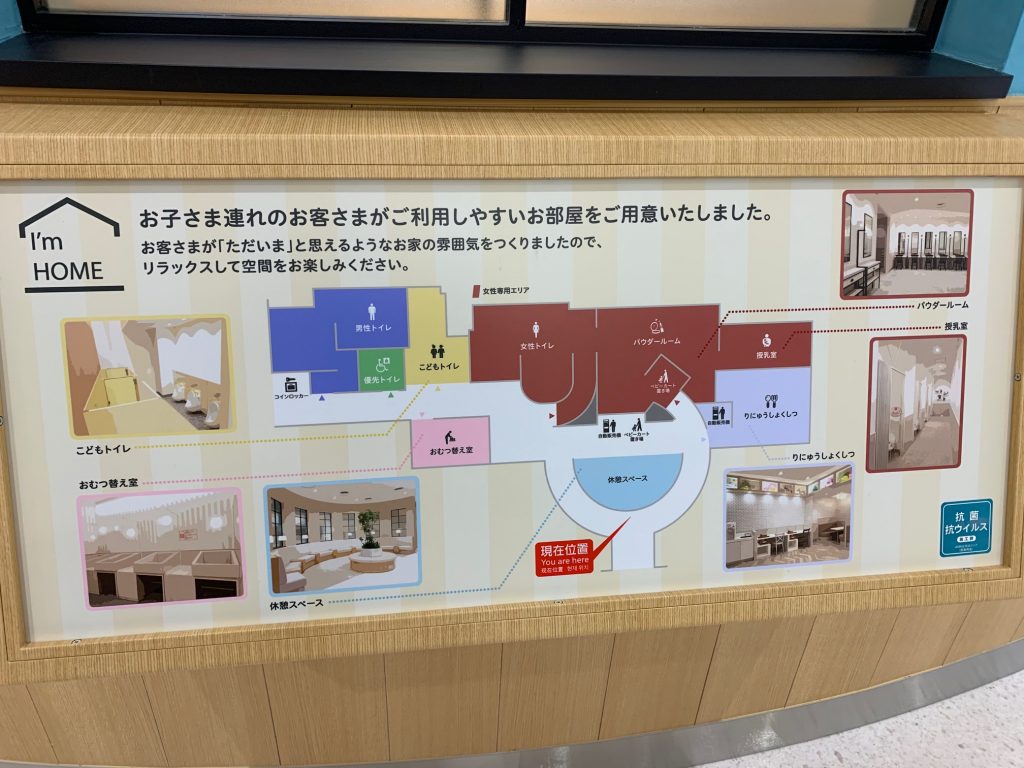 さらにイオンモール新利府南館では、キッズ連れのファミリーのための心遣いも充実しています!お手洗いスペースのすぐそばには、子供連れでもリラックスして利用しやすい、ファミリー専用の部屋が並ぶ「I’M HOME」エリアがあります。