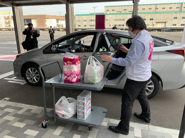 インターホンで呼び出しすると、このように、ドライブスルー方式で商品を受け取れるんです。スタッフさんが荷物も車に積み込んでくれます。VIPですな~!
