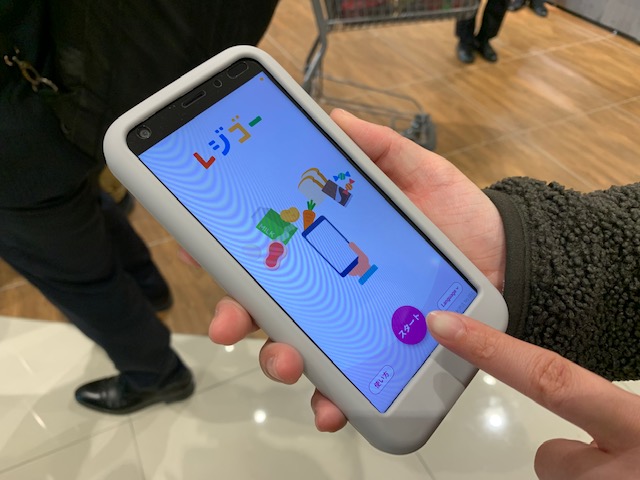 店舗入り口付近に設置された貸し出し用の専用スマホで、客自身が商品のバーコードをスキャン