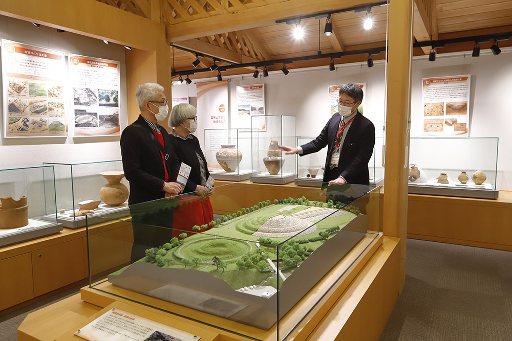 館内にも『雷神山古墳』のミニチュア模型が。左半分は建造当初、4世紀後半の様子を再現しています。「比較してみるのもおもしろいですね」とbonさん