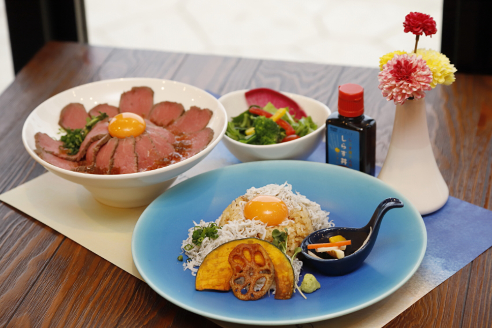 1番人気は「ストップ!」というまで追いしらす放題の「釜揚げしらすプレート」。追いしらすは1摘みが約80gで平均は3~4回だそうです。自家製ローストビーフがたっぷりのっている「自家製ローストビーフ丼」(1,408円)を始めとする肉料理やカレーも人気です。
