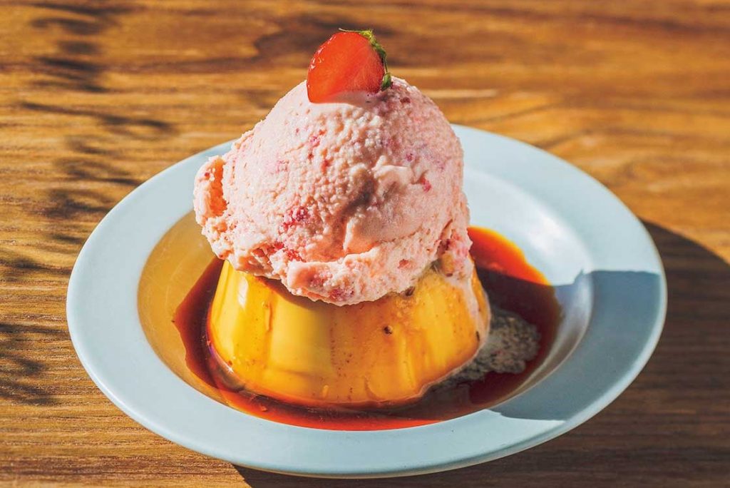 おしゃれな空間の隠れ家的お蕎麦屋さん『OTAFUKU』。カフェメニューとして大人気の自家製「固めのプリン」(400円)は、新鮮なタマゴときび砂糖を使用したやさしい甘さ。季節のアイスをのせた「プレミアムアイスプリン」(800円)も見逃せない!