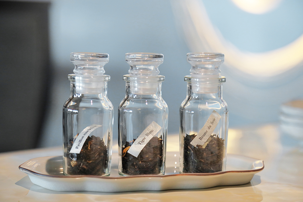 厳選された良質な茶葉に天然由来のフラワーエッセンスやドライフルーツ、ハーブやスパイスなどを贅沢にブレンドして作られるお茶。実際に香りを試しながら、お好きな一杯をセレクトすることができます