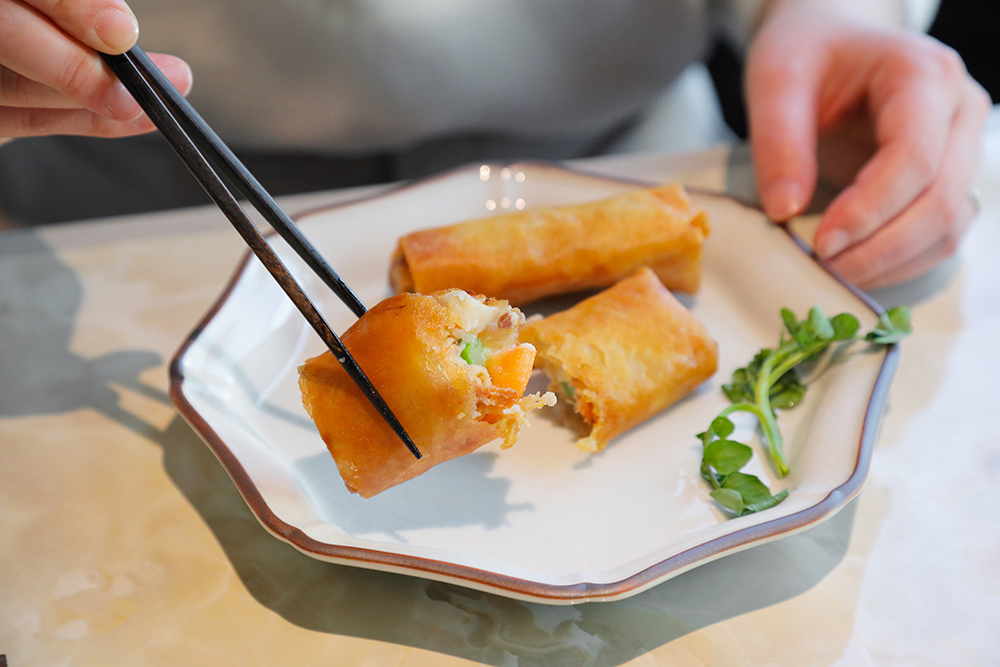 「海老とアスパラガスの『桂花苑』XO醤 春巻」。ぷりぷりのエビとシャキッとしたアスバラガスがごろっと入った春巻きは、食べ応え十分です※写真は2名分