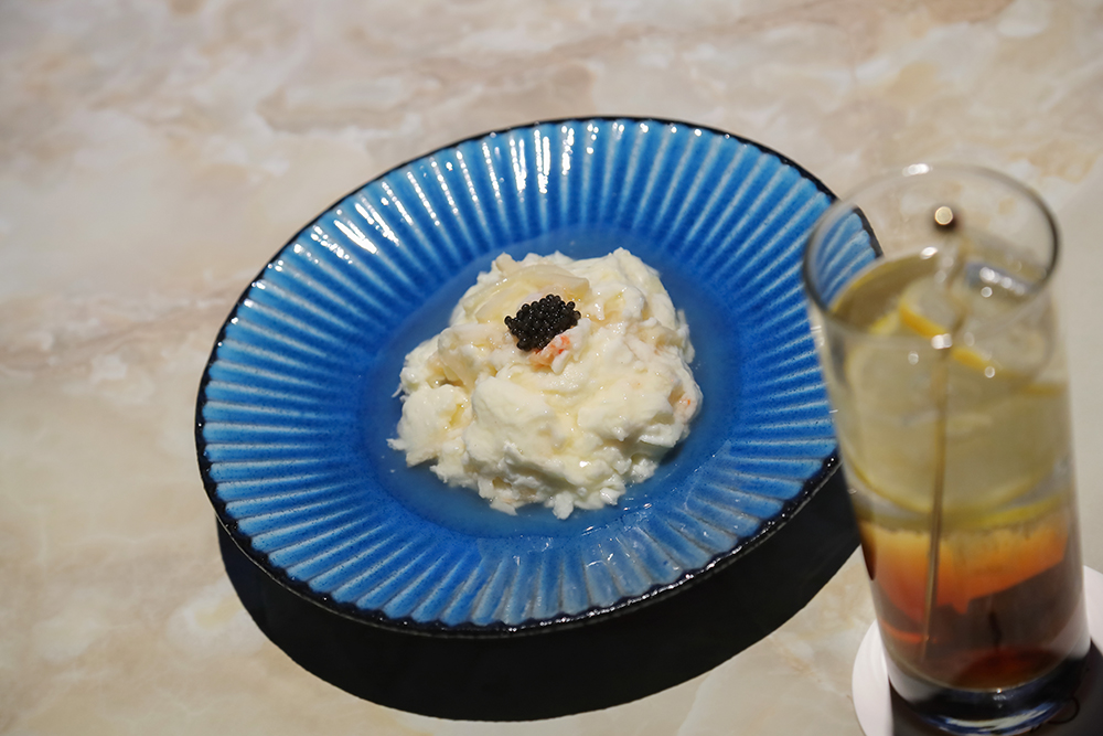 ふわふわで、口の中でしゅわっと溶ける「白い蟹玉 キャビア添え」(1,600円)。この味わいは、新体験!