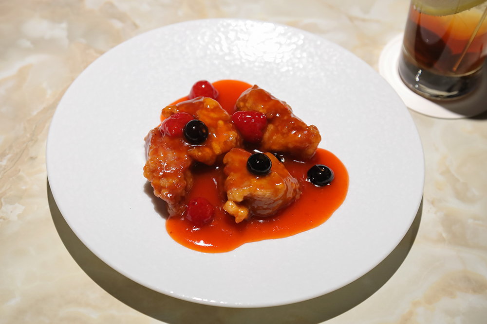 ラズベリーやブルーベリーと、イチゴジャムや山査子(サンザシ)を入れて作られた甘酢でからめた「ベリーベリー酢豚」(1,500円)。フルーティーな味わいに思わずうっとり※写真は2名分